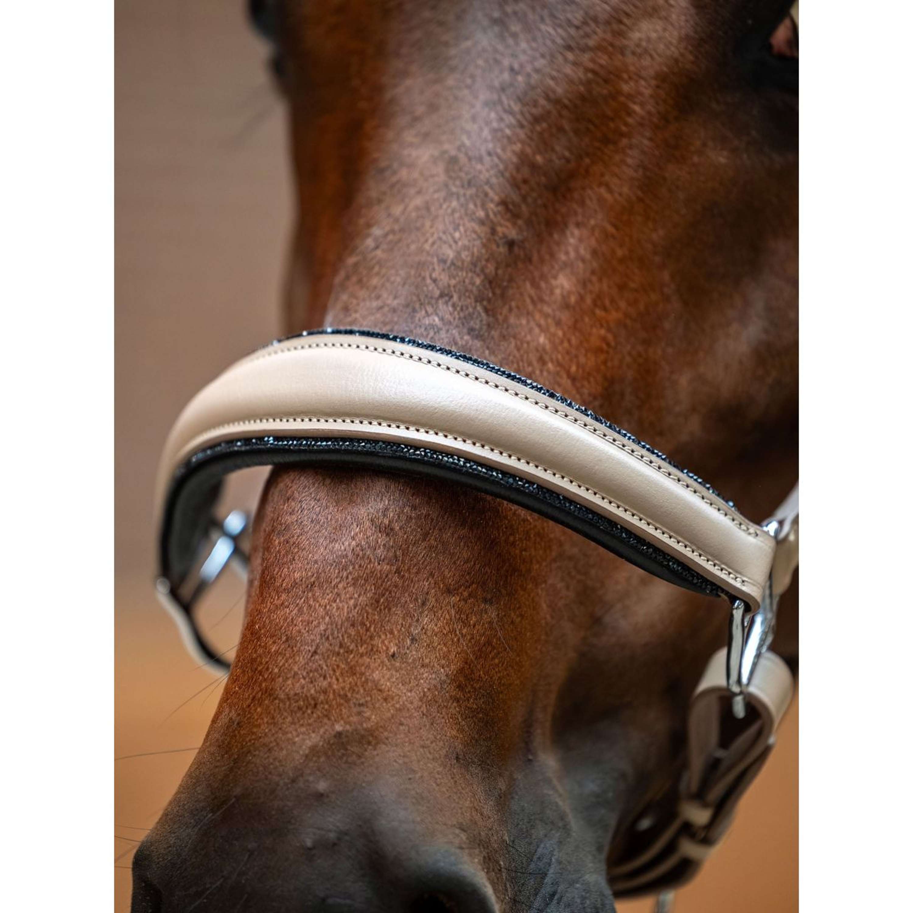 This luxurious anatomical competition halter comes in an elegant beige color and is adorned with beautiful black crystals along the noseband.