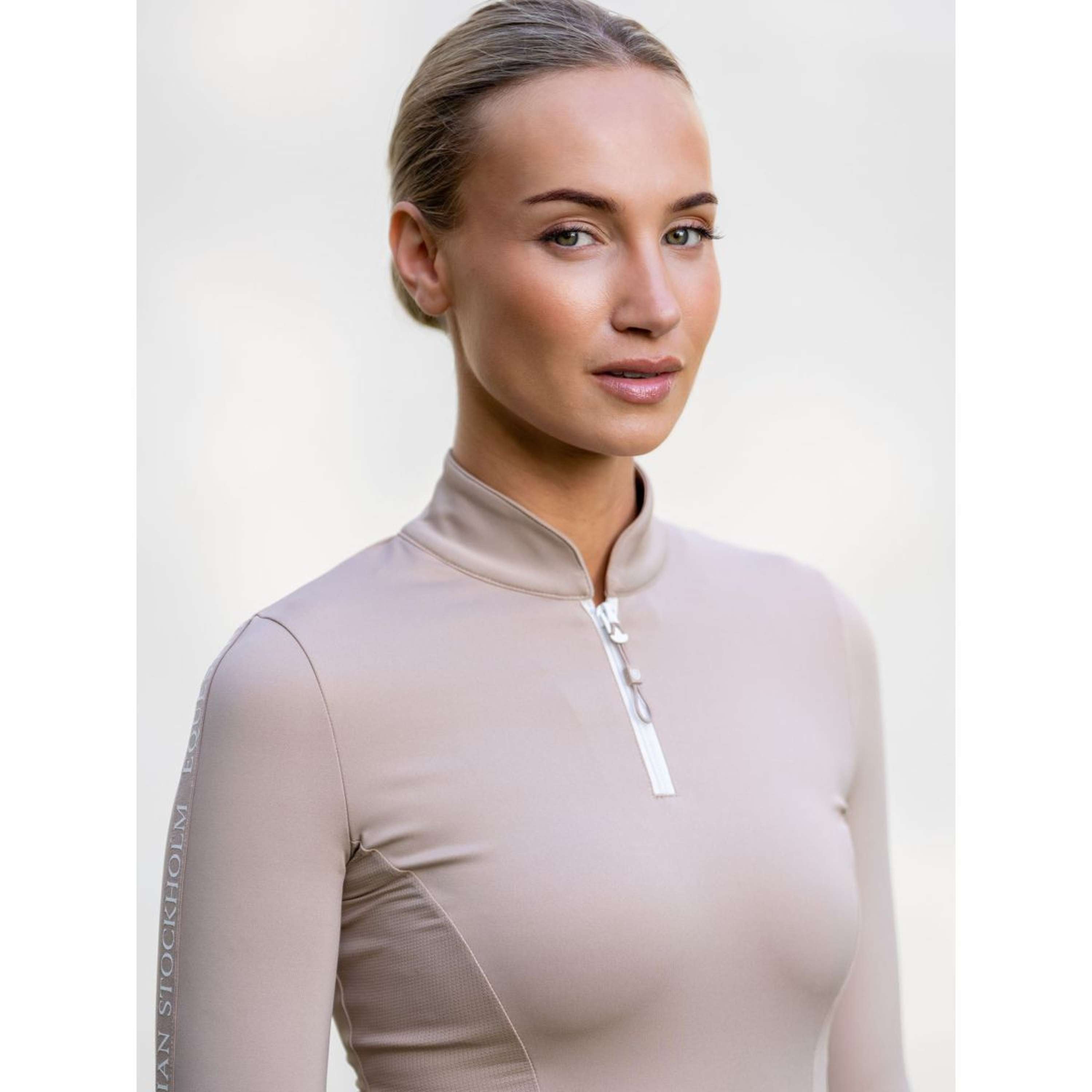 Our Power Top in beige with white details is designed to give you an unstoppable feeling! The top is made of breathable recycled polyester and feels soft and comfortable all day long. Both sleeves are decorated with a white Equestrian Stockholm logo. Combine the top with other items from the Sand collection for a complete look. The top is available in a wide size, so it fits you perfectly.