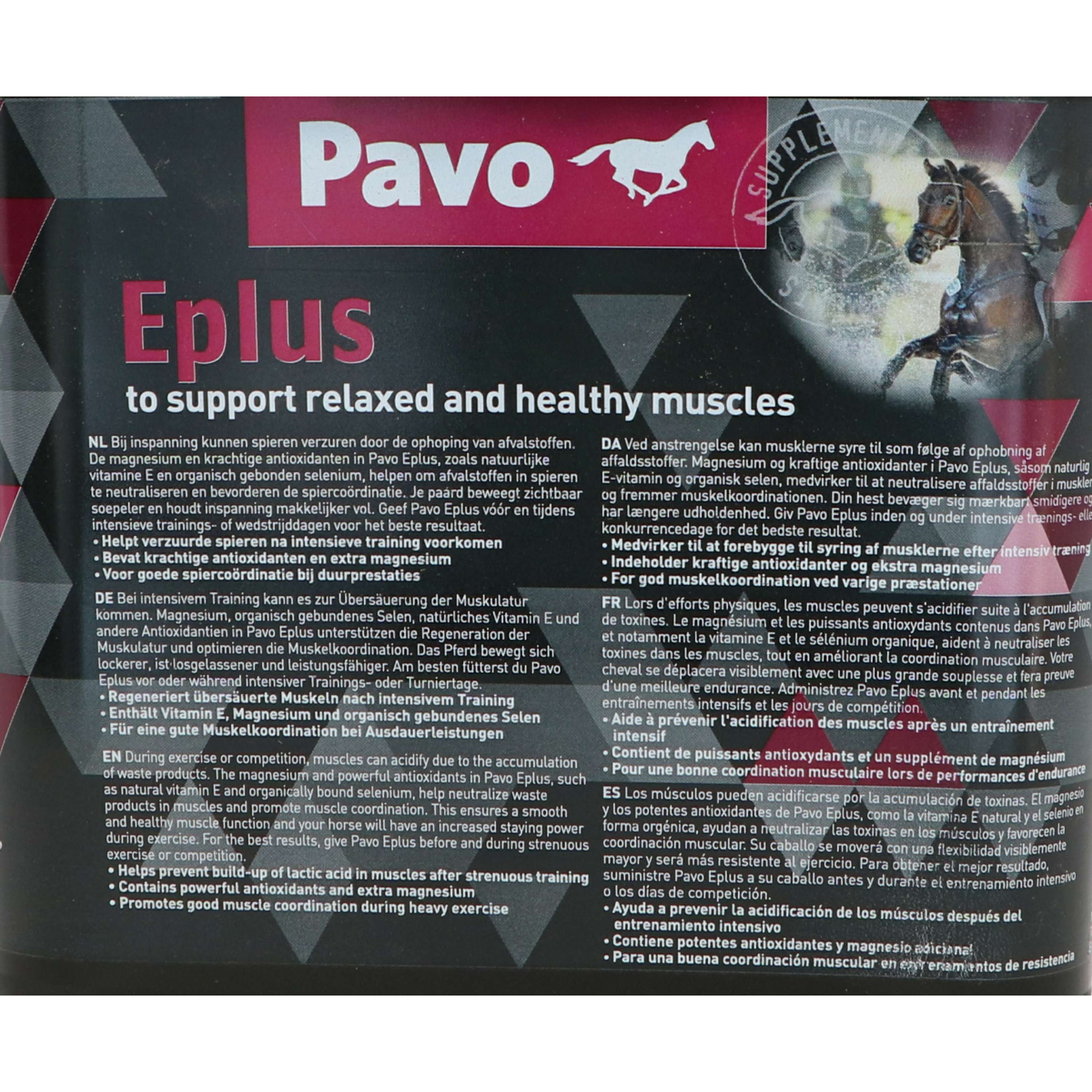 Pavo Eplus contains the natural CellProtect antioxidants, which help neutralize waste products in the muscles. It also contains vitamin C and vitamin E. Many muscle supplements contain a synthetic vitamin E variant, which comes from the oil industry. However, Pavo Eplus uses a natural vitamin E from plant-based materials, which is better absorbed by horses. Research has shown that sport horses have a high need for vitamin E to help remove waste products from their muscles. This can amount to as much as 2000 units per day, a level so high that it cannot be supplemented with concentrated feed alone.