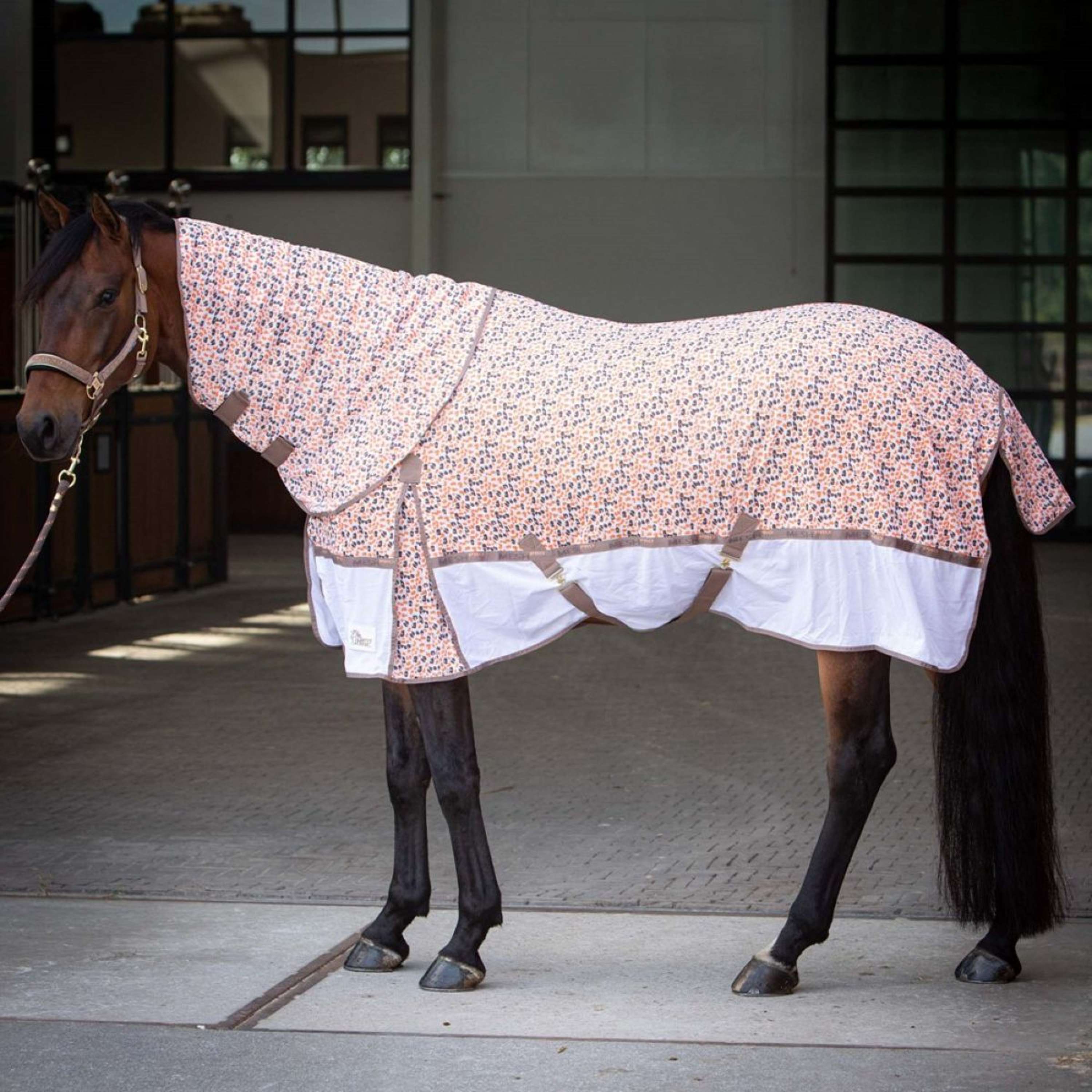 Mesh-Pro horse rug suitable for use as a fly sheet or cooler rug. Features a double front closure, detachable neck with three closures and lining to protect the mane, cross surcingles, tail flap, and tail strap. The chest area is lined with polyester.