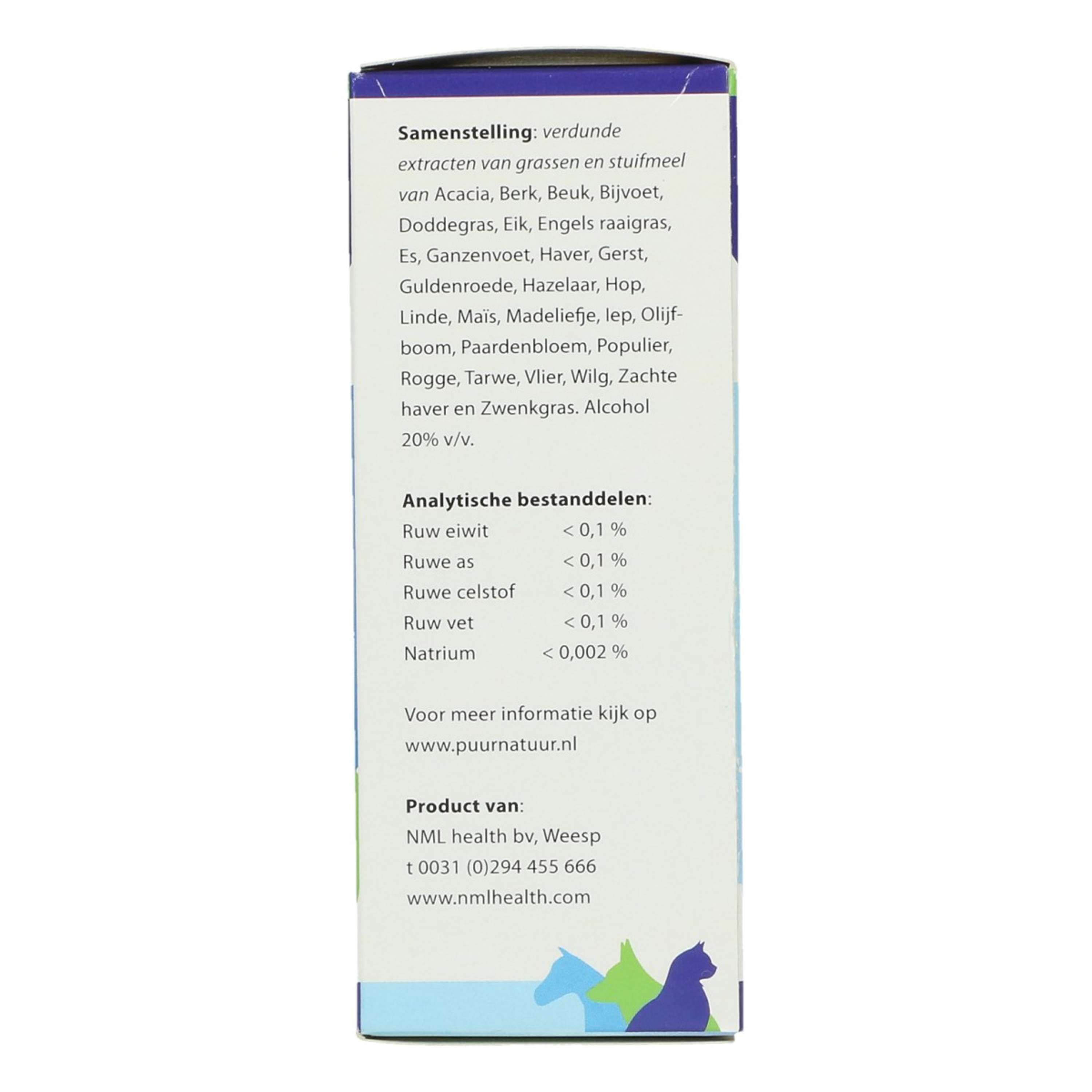 With some dilutions and extracts, a short-term worsening may occur at the start of treatment. This means the animal is reacting to the product. If the dose increases significantly, halve or temporarily stop the dose and then gradually increase the dose. Administer this product directly into the mouth using a plastic syringe, diluted with a little water if necessary. Preferably not with a meal, as the product works better when absorbed through the clean oral mucosa. If an animal does not like the product, the drops can be given on a small piece of treat. If the cat does not accept the drops, put the drops on a warm spoon and allow the alcohol to evaporate from the product. Then give it diluted with a little water or milk using a syringe directly into the mouth. The drops can also be applied to the back of the paw; make sure the cat licks the drops off. Aqua, Tilia cordate, Plantago lanceolate, Solidago virgaurea, Urtica dioica, Avena sativa, Taraxacum officinale, Betula alba. Alcohol 30% v/v