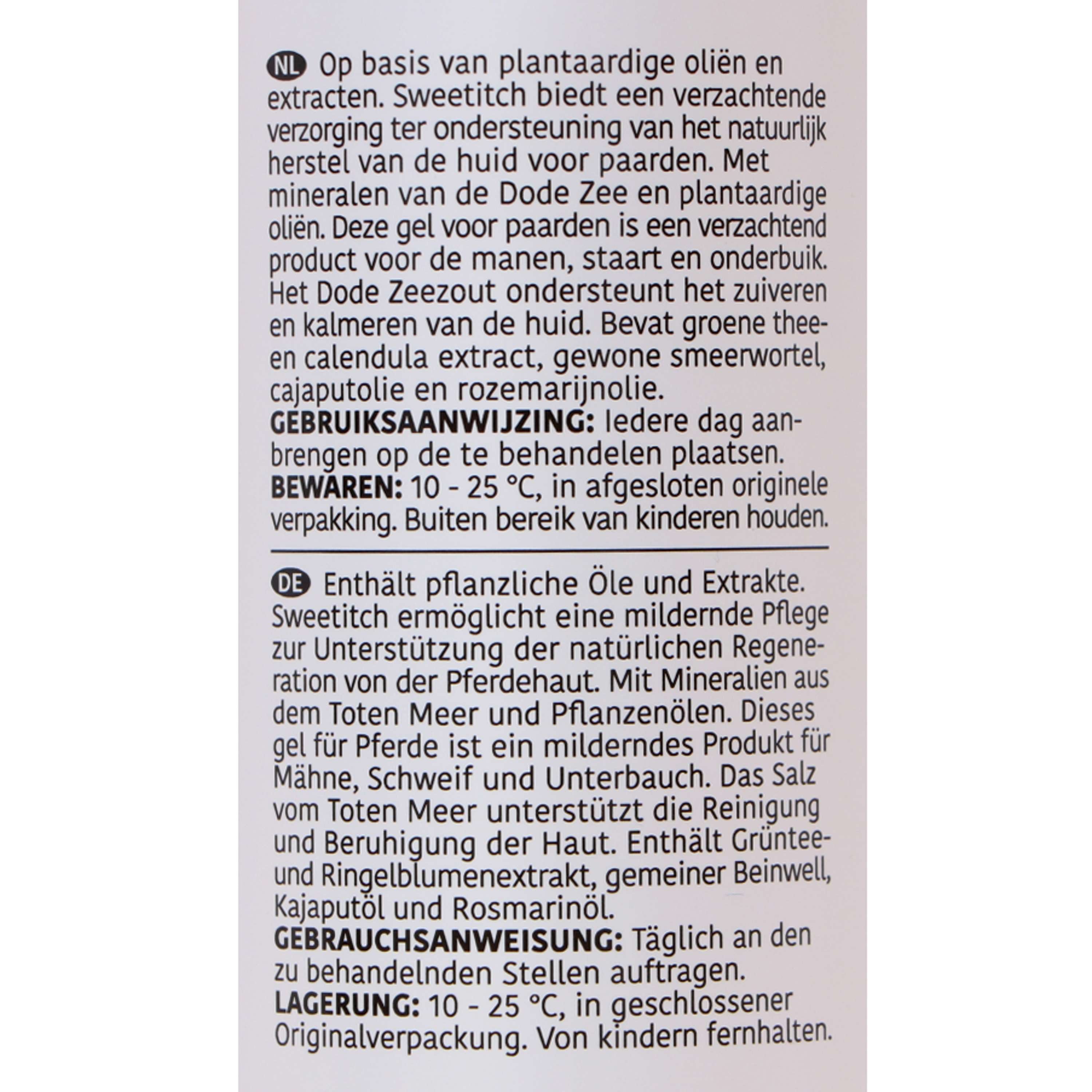Sweetitch has been specially developed for horses with sensitive skin, for example around the tail and mane. Sweetitch has a soothing effect on the skin and supports the natural recovery of the horse's skin. It's important to use Sweetitch early to keep the skin calm and minimize the appearance of summer fever. Sweetitch is a unique gel that has been formulated with great care. In addition to minerals from Dead Sea salt that purify and soothe the skin, Sweetitch contains several important plant oils and extracts. Green tea extracts soothe the skin, Rosemary oil has a cooling effect, and Cajaput oil has a soothing effect. Furthermore, the Dead Sea minerals, together with Calendula extracts, Common Comfrey (Symphytum officinale), and Cajaput oil, support the skin's regenerative capacity. The latter two provide a fresh, herbal eucalyptus scent that you and your horse will surely enjoy. With this gel, you'll tackle spring fever right from the start!