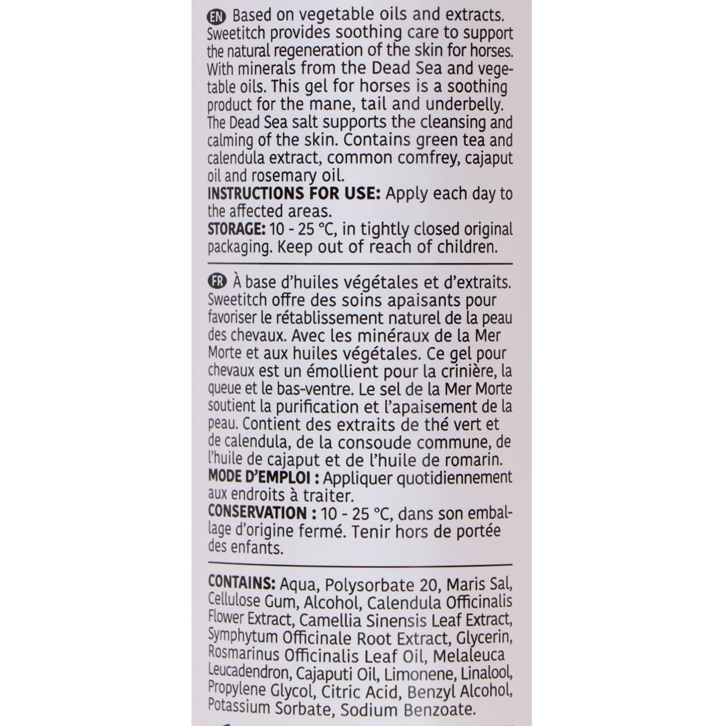 Based on plant oils and extracts, Sweetitch provides soothing care to support the natural recovery of horse skin. With Dead Sea minerals and plant oils, this gel for horses is a soothing product for the mane, tail, and underbelly. Dead Sea salt helps purify and soothe the skin. Contains green tea and calendula extracts, common comfrey, cajaput oil, and rosemary oil.
