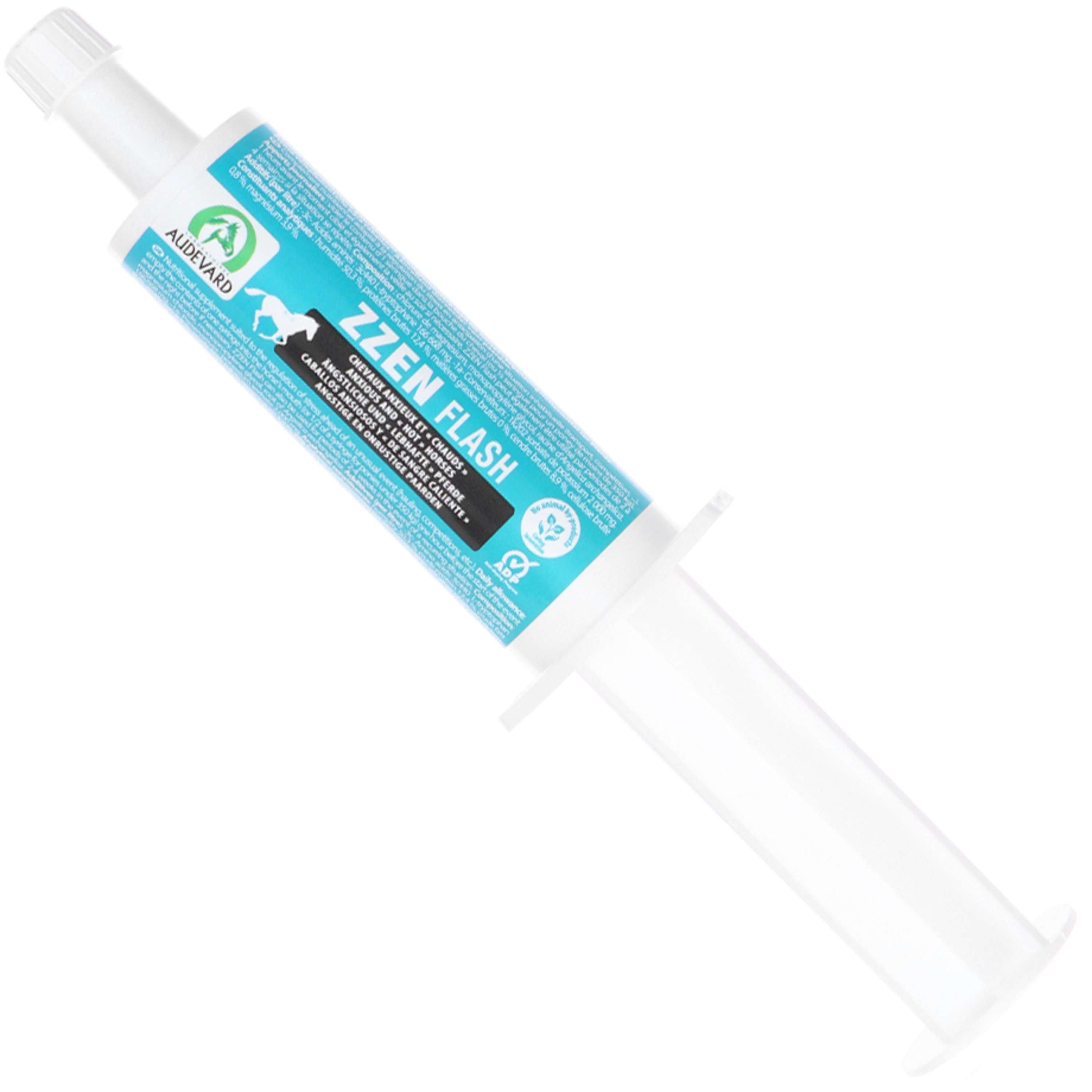 Relieves stress reactions in preparation for unusual circumstances (transport, a competition, etc.). Fast, visible results. Recommend ZZEN FLASH for occasional events, such as visits to the dentist or farrier, clipping, transport, and occasional competitions or rides. ZZEN and ZZEN FLASH can be used together occasionally. Paste/gel in syringe.