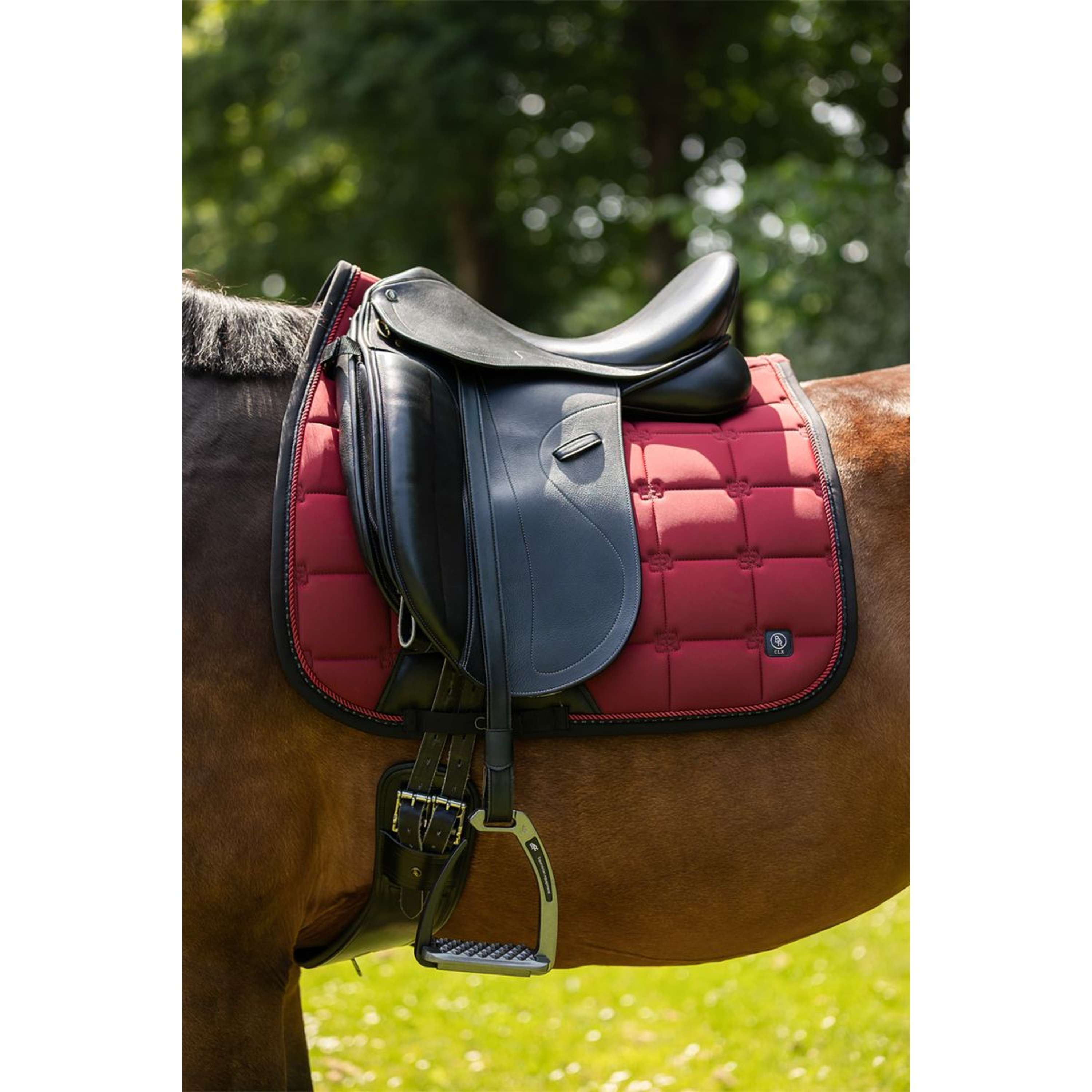 The stylish CLX saddle pad is square quilted with BR logo stitching for a unique look and finished with two subtle piping cords. It features adjustable saddle and girth loops with Velcro and an extra reinforcement of synthetic leather at the girth loop.
