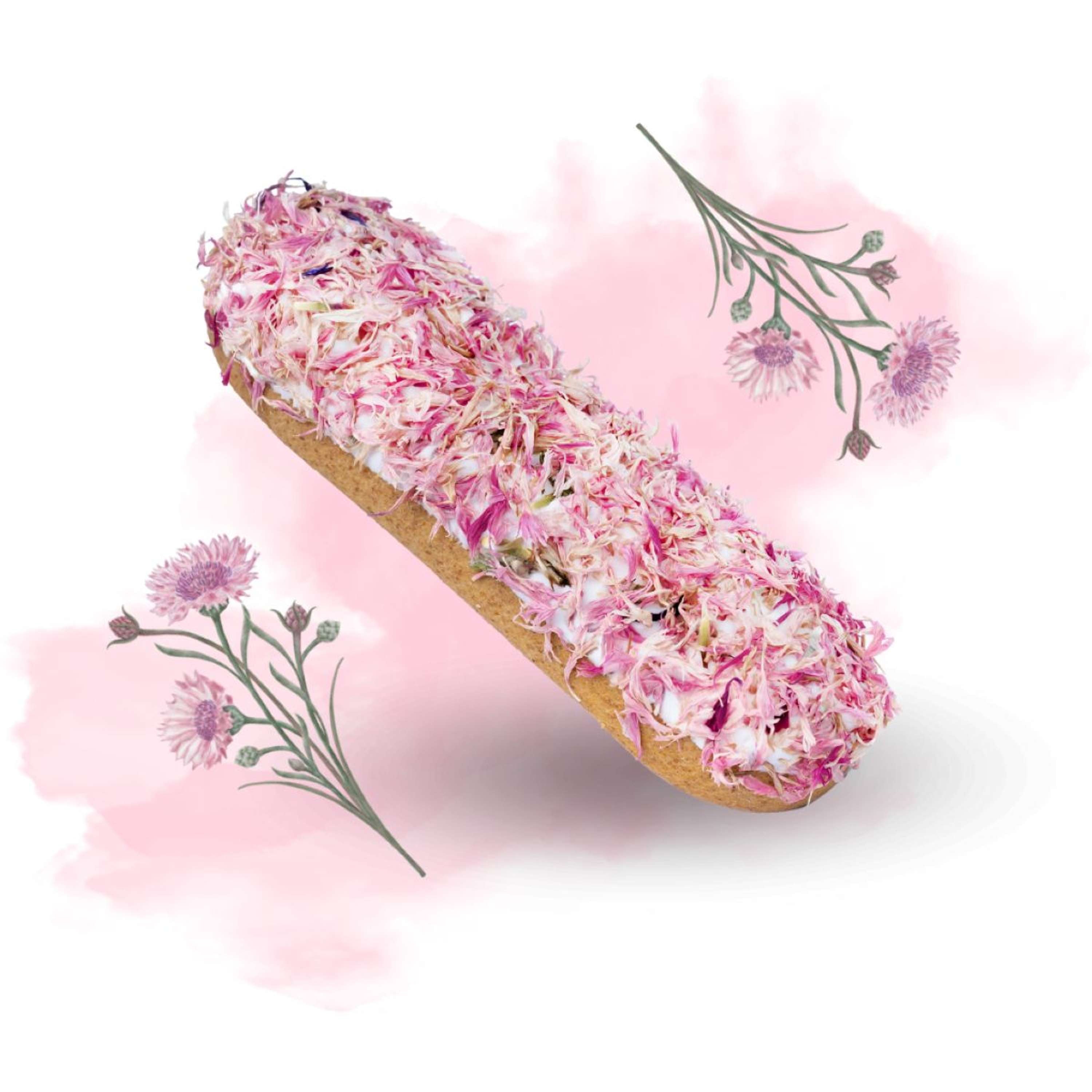 A sweet and elegant horse biscuit with icing and delicate cornflower petals: handmade, natural, and perfect for celebrating special moments.