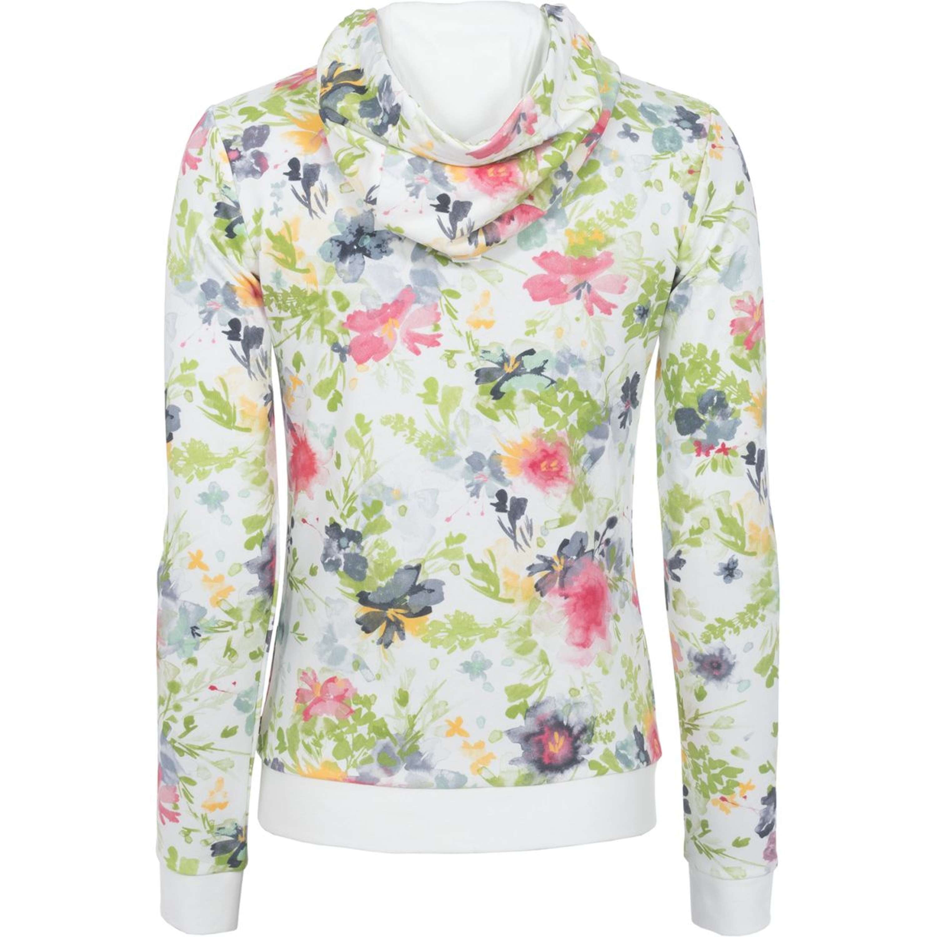 Modern hoodie with floral pattern. Short zip with Cavallo pendant in the centre front. Hood can be fixed at the back and has an individually adjustable drawstring. Elasticated ribbed cuffs and hem for extra comfort. Cavallo stirrup embroidery on the left chest.