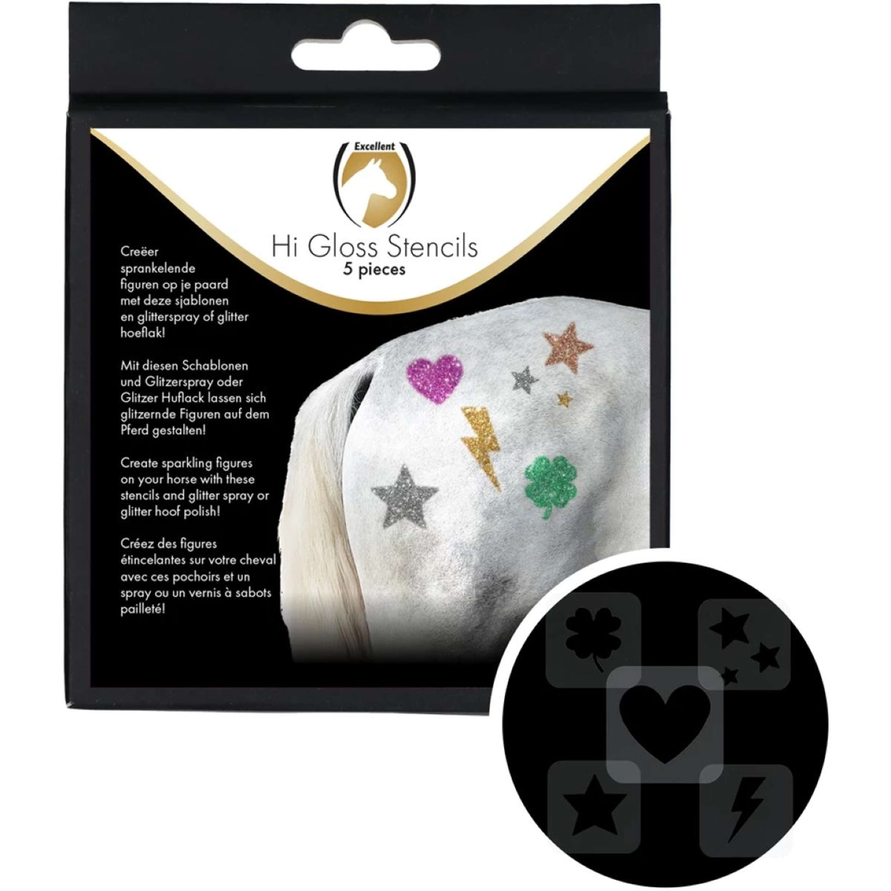 Want to make your horse stand out? With Excellent Templates, you can create dazzling designs in no time! These sturdy plastic stencils are perfect for use with Excellent Horse Hi Gloss Glitter Spray or Excellent Horse Hi Gloss Glitter Hoof Polish.