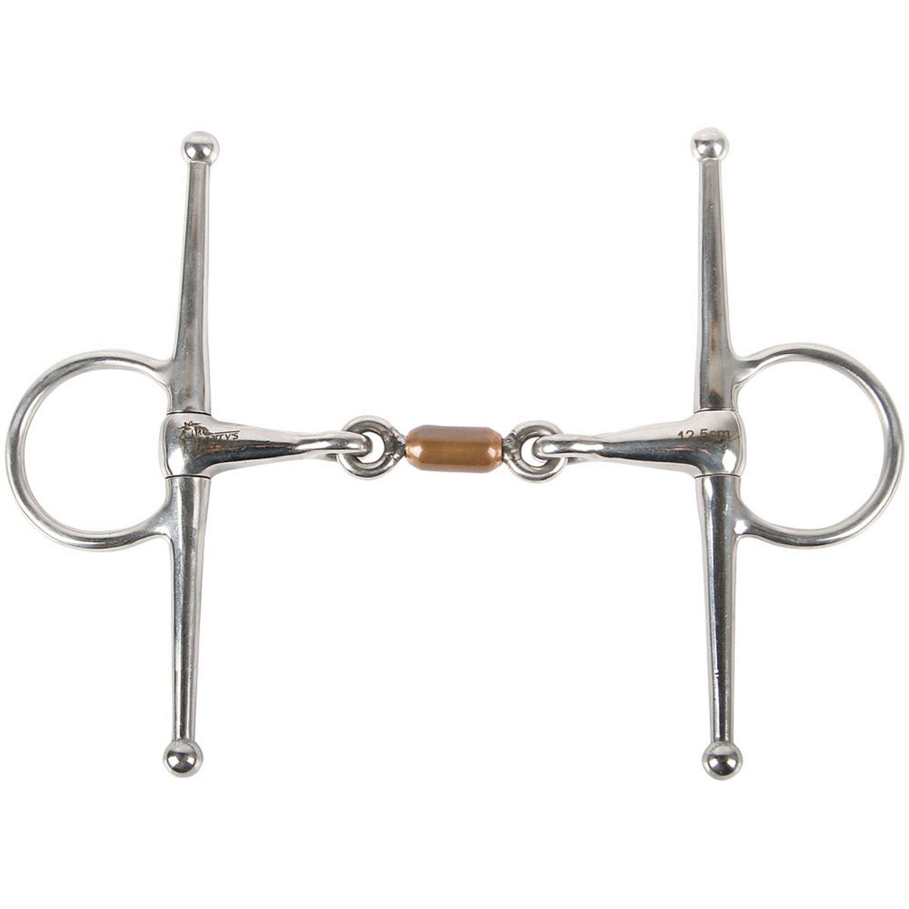 Stainless steel, French mouth with copper roller, mouthpiece 13mm. Due to the full cheeks this bit stays perfect in place and the pressure on the cheeks helps you with turning aids and is easier for your horse to understand.