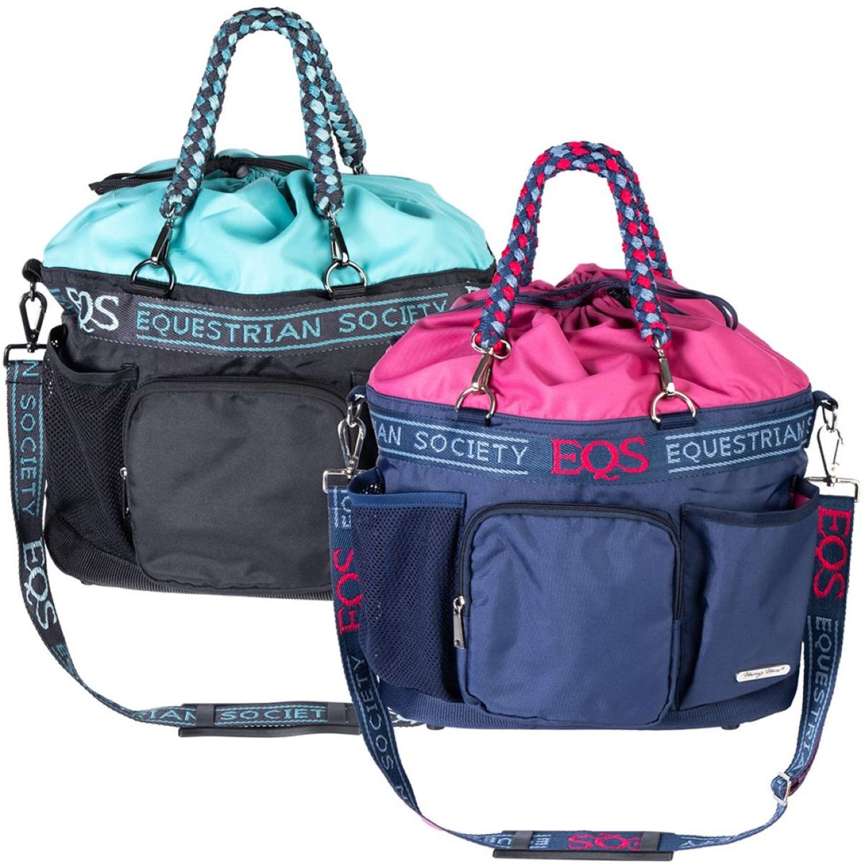 Grooming bag with webbing trim featuring the EQS logo, contrast top closure with multicoloured drawstring. Three exterior storage pockets, one with zipper. Unique multicoloured "lead rope" handles, adjustable shoulder strap with EQS logo, and plastic protective studs on the bottom.