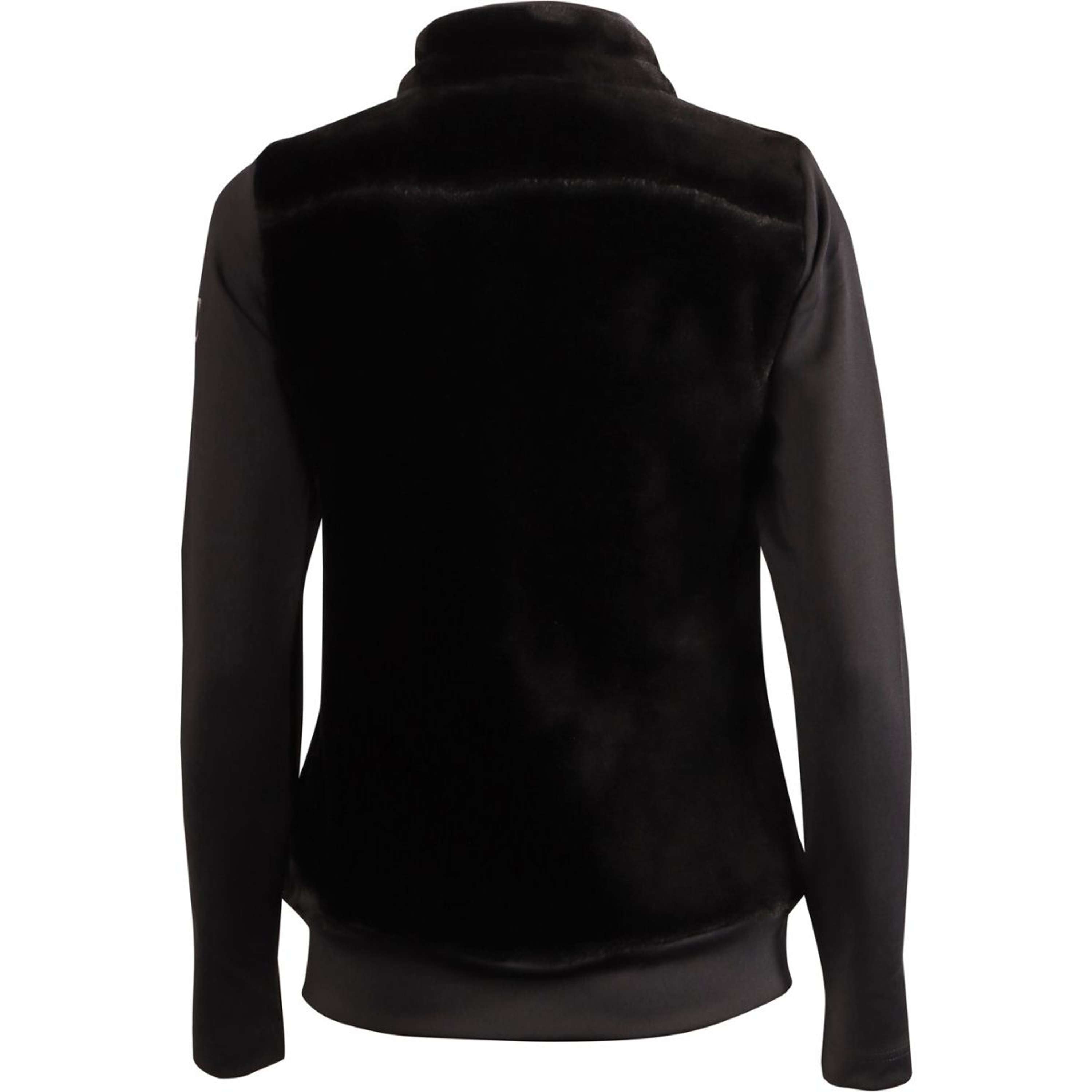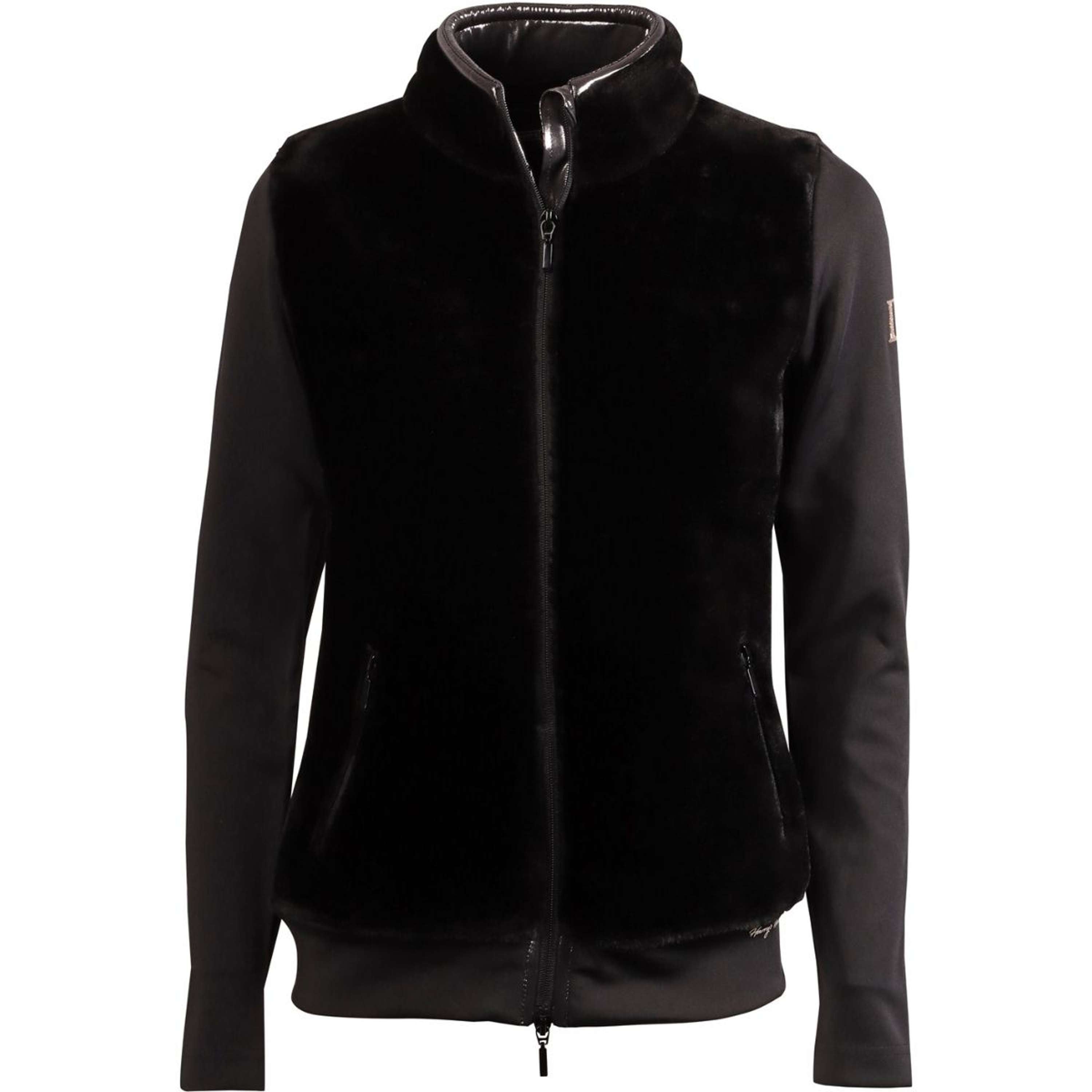 Jacket with a body made of soft faux fur and stretch fabric sleeves, two-way zipper, two zippered pockets, and shiny material on the inside of the collar.Composition: Body: 100% polyester, sleeves: 94% polyester / 6% elastane.