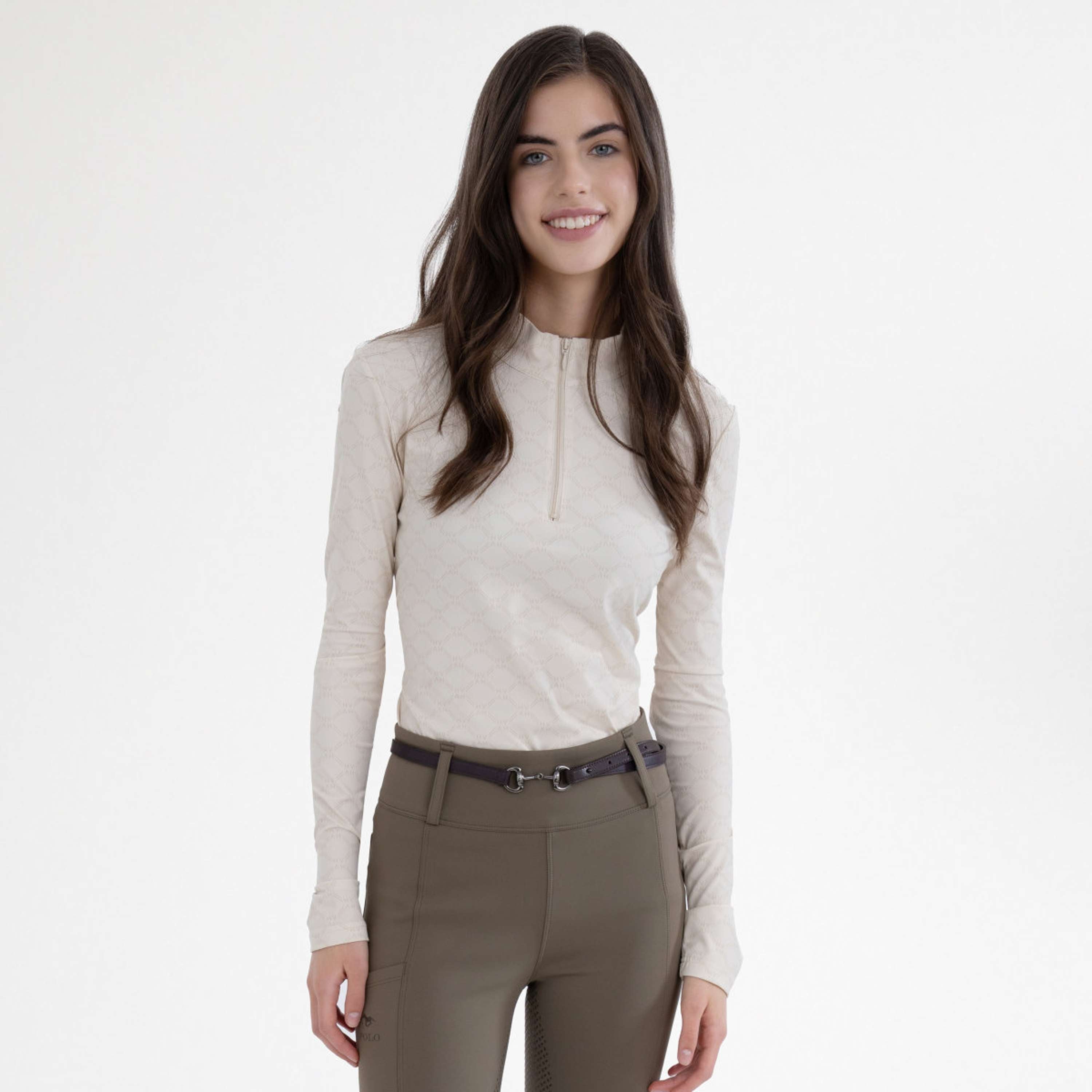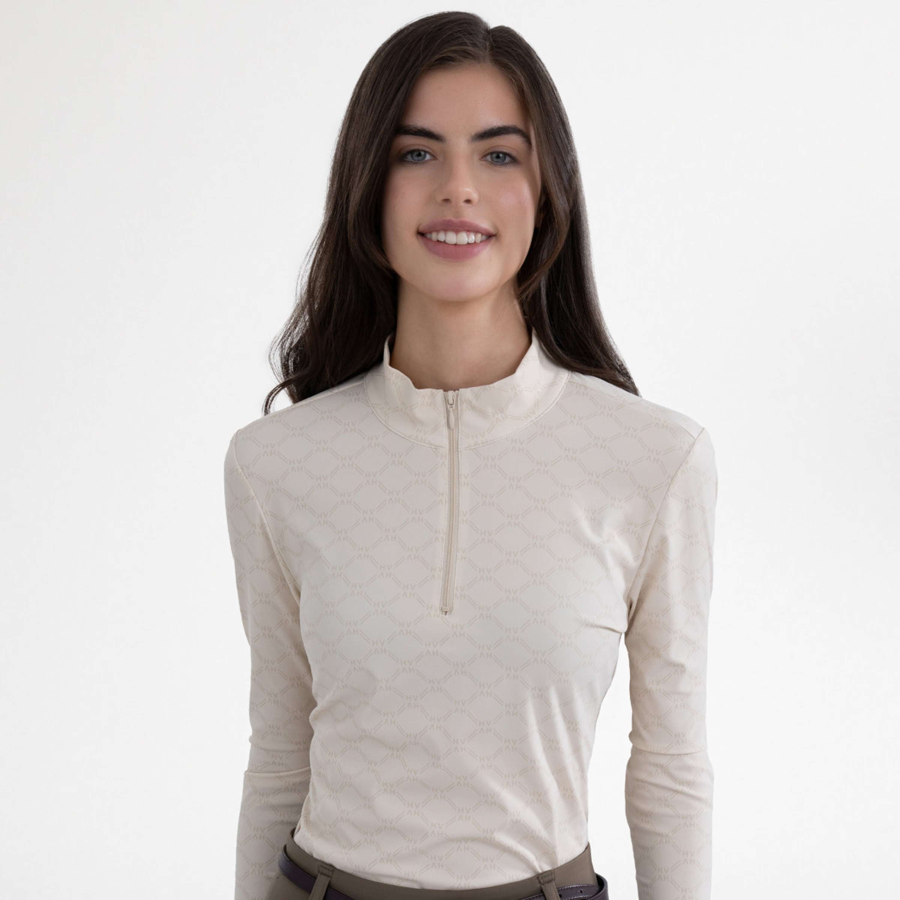 HVPNadia Top – Functional, Stylish & ComfortableWhether you're looking for the perfect balance between performance and elegance in the stable or during your training, the HVPNadia Top is exactly what you need. This technical top pays homage to your passion for equestrian sports, offering unparalleled comfort without compromising on style. With its refined all-over print and tailored fit, the HVPNadia Top effortlessly combines functionality with chic appeal, so you always feel confident and comfortable in the saddle and beyond. Made from breathable and quick-drying functional material, this top keeps your body temperature stable even during the most intense rides or training sessions. The 4-way stretch ensures optimal freedom of movement, while the UV protection protects your skin from the sun. The long sleeves and the soft material with maximum wearing comfort make this top indispensable for every rider. The rounded collar and the zipper at the center front give a feminine touch and add to the refined look you are used to from HV Polo. Provides UV protection for carefree rides in the sunBreathable functional material keeps your body temperature stableSuperior flexibility and perfect fit thanks to the 4-way stretchSoft and comfortable material for a wonderful wearing feelingElegant tailored model with feminine round collar and zipper