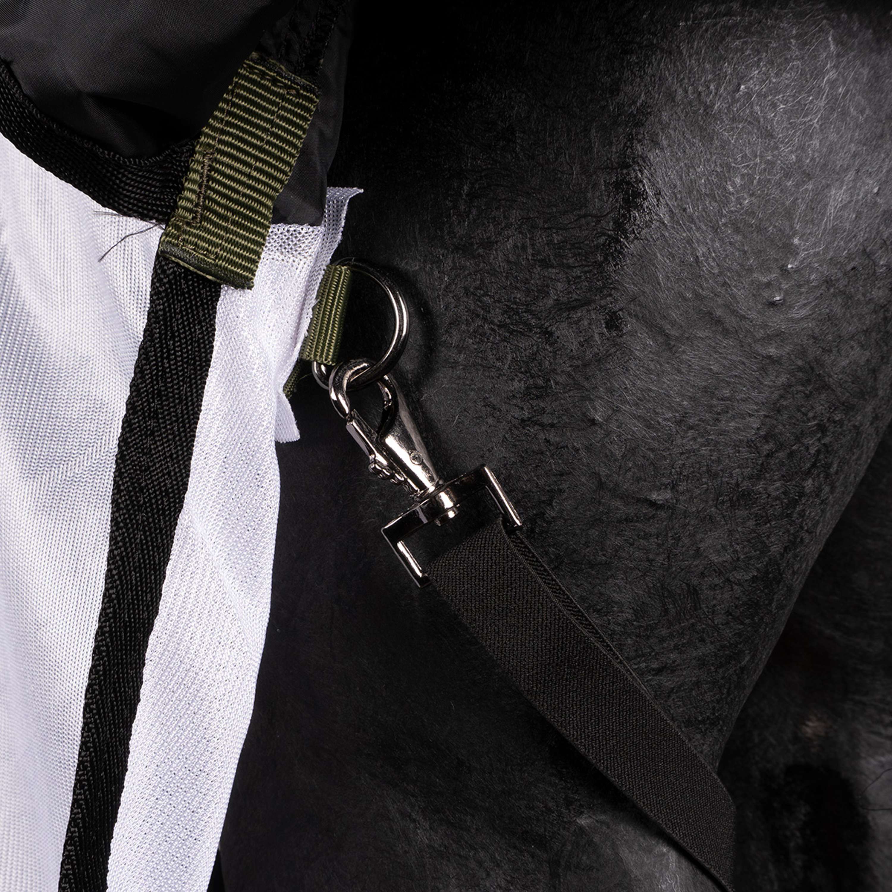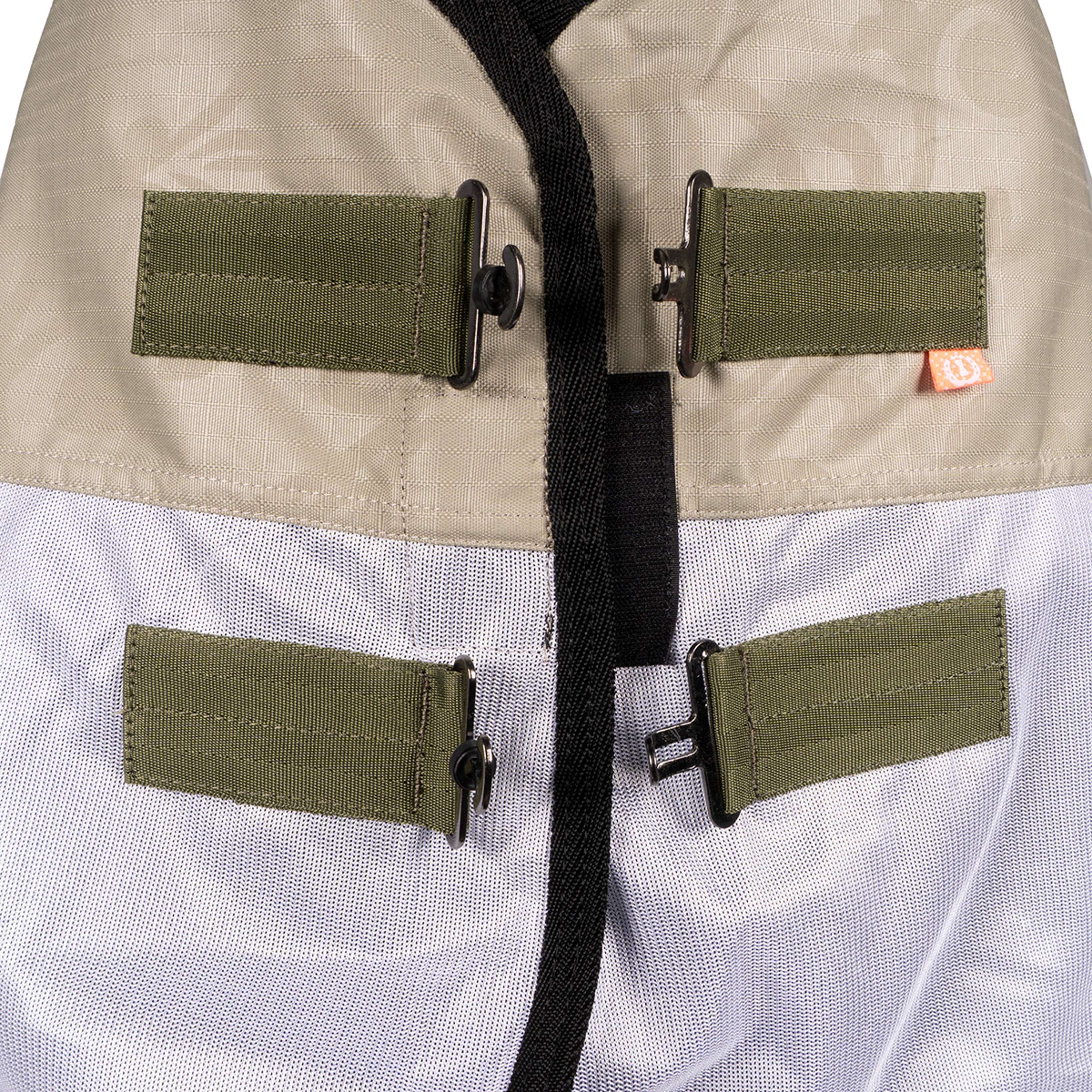 Never doubt again which blanket your horse should wear in spring and summer! This 2-in-1 blanket offers not only great wearing comfort but also protection in various weather conditions. In a summer shower, your horse stays dry due to the water-resistant top layer (featuring the well-known Imperial Riding floral print!). Moreover, the lightweight and breathable mesh material makes it a perfect fly rug. The blanket has a double belly flap and is equipped with 3 girths around the belly, 2 elastic hind leg straps, ergonomically shaped tail flap and leg folds for maximum freedom of movement. With the buckle system and Velcro on the chest, this blanket stays perfectly in place. In short, this water and insect resistant blanket is a real must-have for your horse! Please note: the neck part is sold separately.