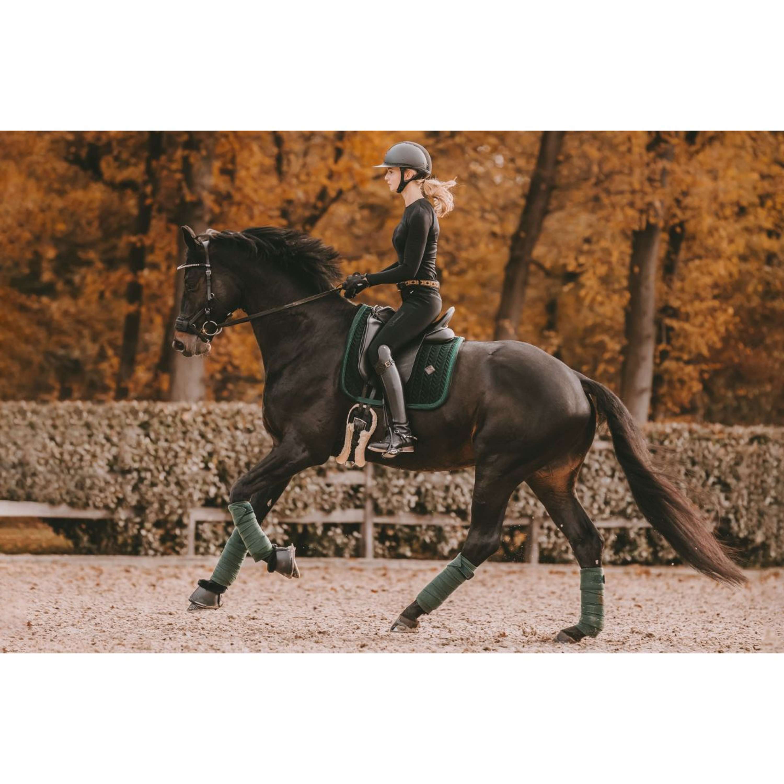 Keeping your saddle pad clean is a breeze. To prevent any chafing from dried sweat, we recommend washing it often, especially if your horse sweats a lot during training. Simply pop it in the wash at 30°, but don’t put it in the tumble dryer. Using a laundry bag will keep those lovely pearls undamaged.