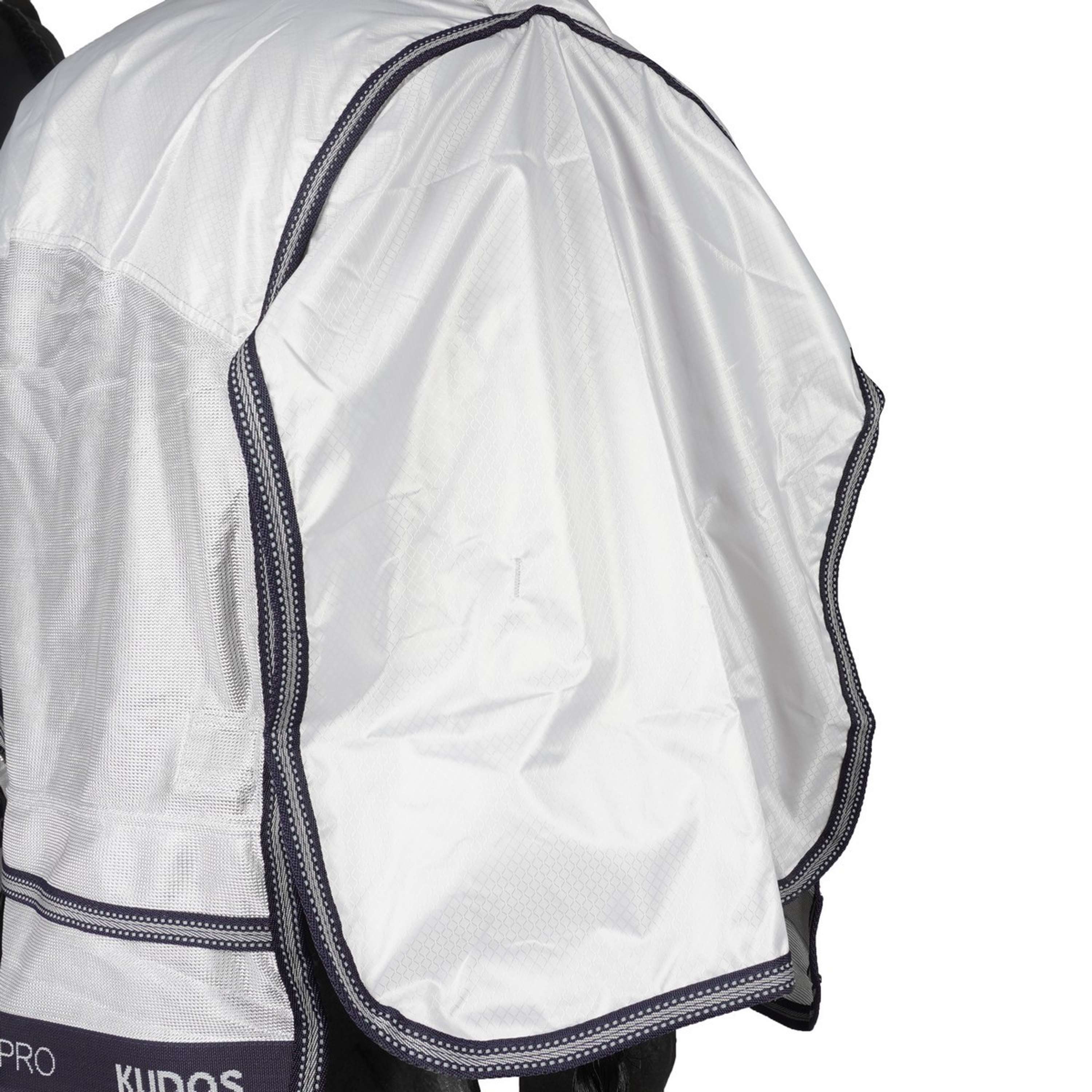 The Kudos Show Pro Fly Rug offers essential protection against flies and biting insects in wet weather. This waterproof fly rug is designed to provide maximum protection for the horse's body against insects. The waterproof upper is made from durable 420 Denier Diamond Ripstop, while breathable micro mesh protects the horse's belly.