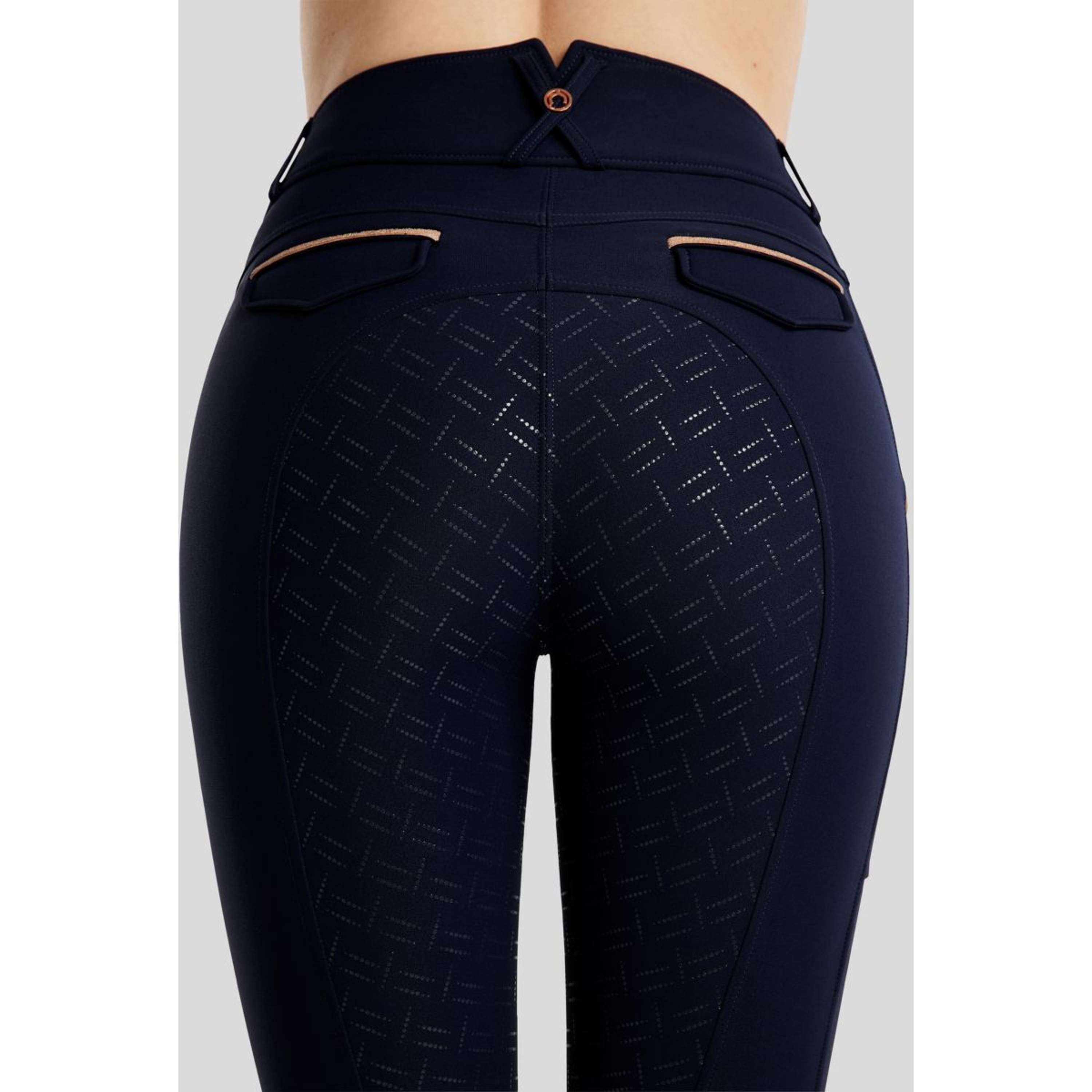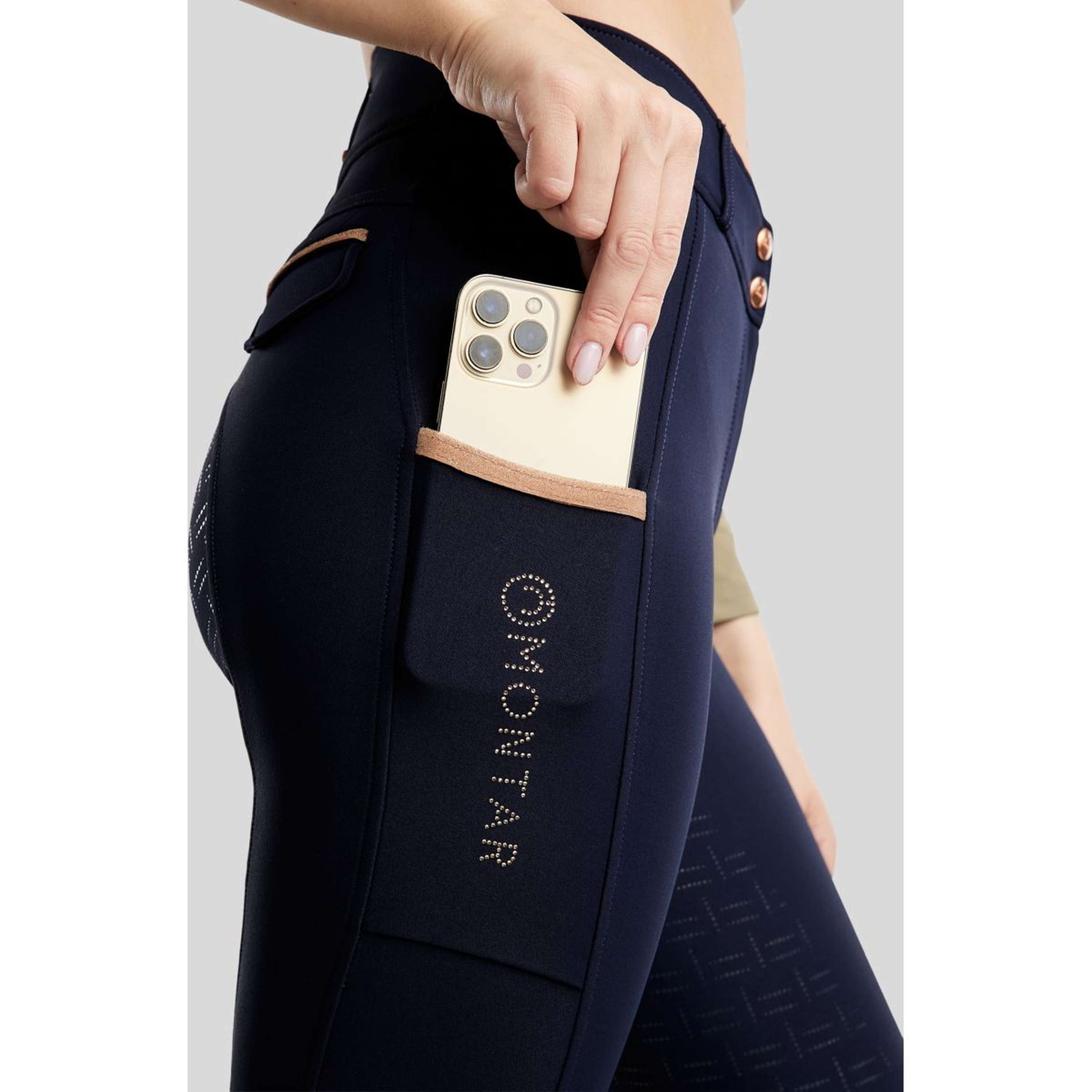 MoGlenda Rosegold Caviartape Breeches with Phone Pockets and Decorative Back Pockets – The Perfect Combination of Style, Comfort, and Functionality. With eye-catching details, these breeches are perfect for riders who value both style and performance.Yati Quality: The breeches are made from 93% Polyamide Mechanical Stretch and 7% Elasthane, which is our well-known Yati fabric, offering elasticity and flexibility. The fabric ensures a perfect fit and maximum freedom of movement. Yati material is breathable and moisture-wicking, keeping you comfortable whether you're riding or working in the stable.Stylish Rosegold Caviar Details: The breeches feature beautiful rosegold caviar tape on the top of the phone pocket and on the decorative back pockets, adding a luxurious touch to your riding outfit. The Montar logo is discreetly written down the side of the phone pocket with rosegold crystals, adding a sophisticated shine.Functional Pockets: MoGlenda breeches are both stylish and practical, with the phone pocket ensuring that your phone is always safely stored.Functional Grip: The full grip provides optimal stability and comfort in the saddle, giving you better traction and support during your ride.