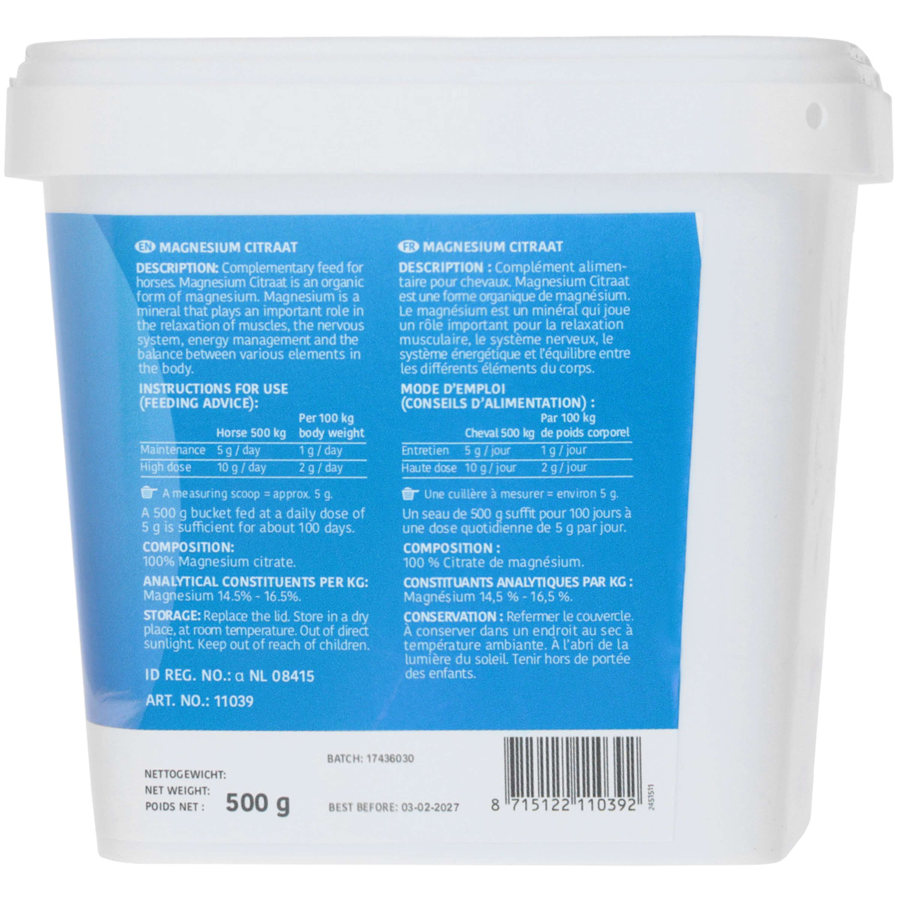 Magnesium citrate is an organic form of magnesium and is therefore very well absorbed by the horse.